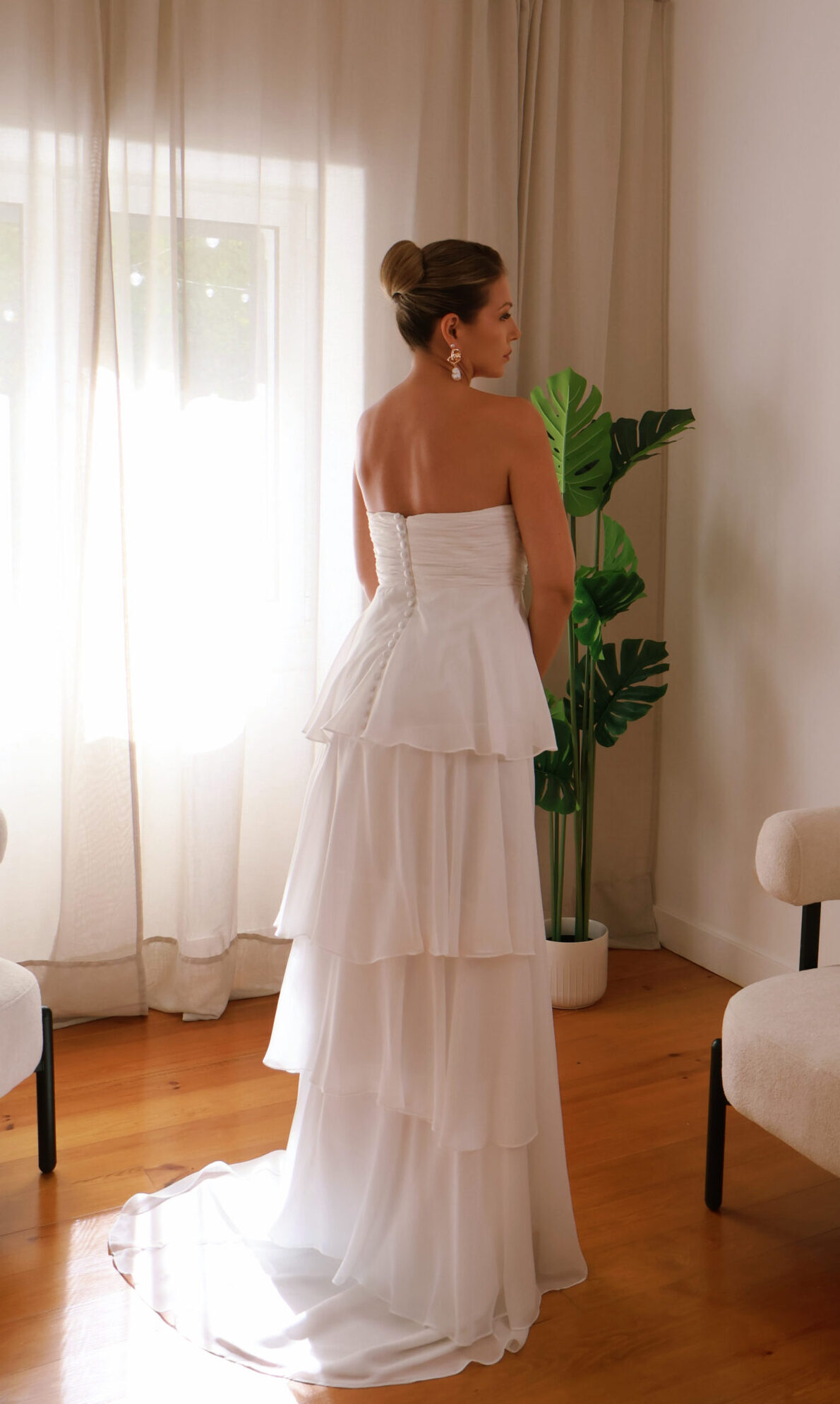 Um vestido que é a definição de leveza e romance moderno. Com modelagem tomara que caia estruturada valorizando o colo e os ombros com sofisticação atemporal. Suas saias fluídas de chiffon levemente assimétrico criam um movimento delicado e etéreo a cada passo, perfeito para noivas que desejam uma silhueta elegante sem abrir mão do conforto.